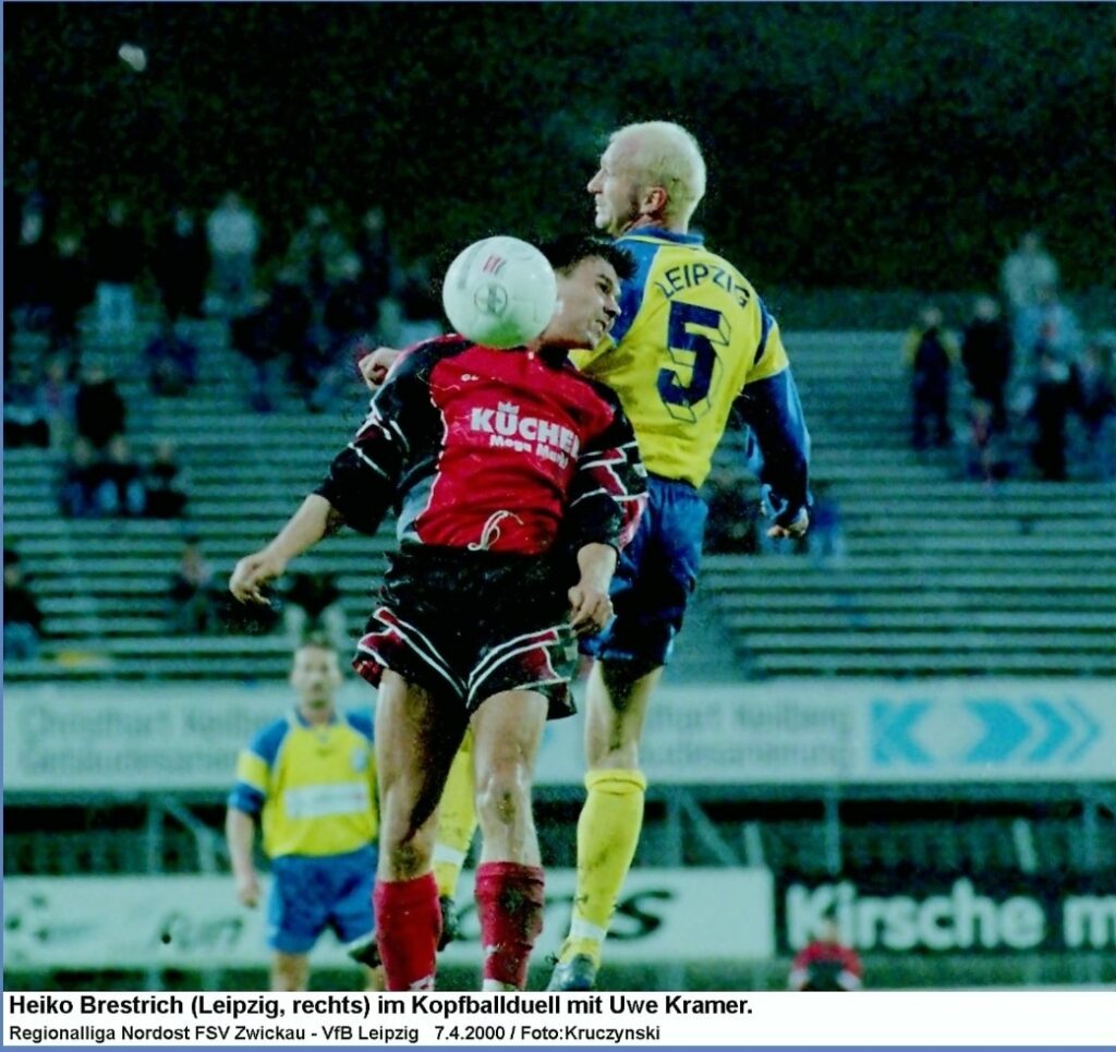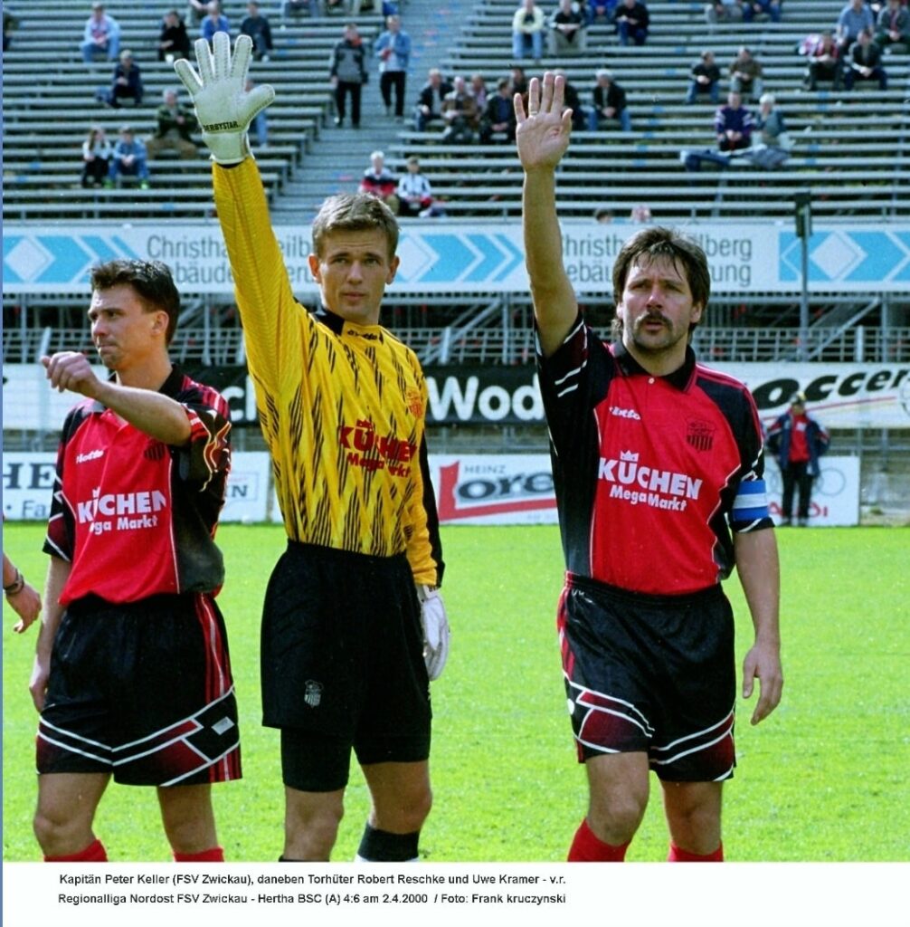 Im November 1999 beantragte der FSV sein erstes Insolvenzverfahren, viele Spieler kündigten ihre Verträge und der Abstieg in die Oberliga unausweichlich. Kurz darauf stieß Uwe zum FSV, der in Aue zwei Saisons zwischen Regionalliga (Erste) und Landesliga (Zweite) pendelte. In der Regionalliga-Rückrunde und den kommenden zwei Oberligajahren verpasste er nur drei Spiele und schoss acht Tore. Über den Dresdner SC und Sachsen Leipzig landete er 2003 in Auerbach, wo er zwischenzeitlich als Co-Trainer, Vorstandsmitglied und Ausrüster auftrat. So sei er es laut VfB-Seite gewesen, auf dessen Mist die Idee mit dem Trikotslogan „Kühe, Schweine, Auerbach“ gewachsen ist. Ein Leben für den Verein, das freut uns sehr. https://vfb-auerbach.de/jetzt-das-vfb-sondertrikot-sichern/