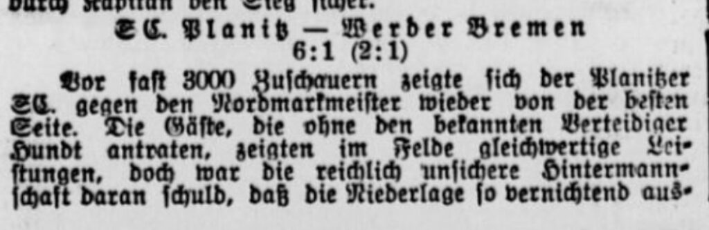 Außerdem wurde Karl Schlösser heute vor 110 Jahren geboren. „Karli“ spielte bis 1935 für den Dresdner SC. Schon als 17-jährigen begeisterte er die DSC Anhänger. Anschließend spielte er 2 Jahre für den Planitzer SC. In dieser Zeit wurde er auch mehrfach in die Gauauswahl von Sachsen berufen. Wir haben für euch einen Spielbericht zu einem Testspiel gegen Werder Bremen herausgesucht, was Planitz klar gewann und Schlösser sich auch in die Torschützenliste eintragen konnte. Er verstarb am 1. Januar 1982.