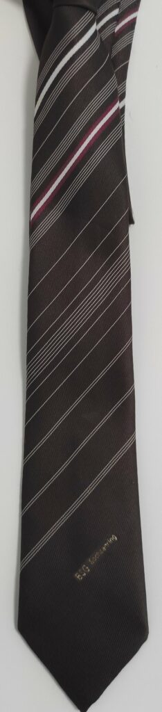 Die bräunliche Krawatte mit dezentem feinen Rot-Weißen Querstreifen haben wir als Schenkung von R.H. erhalten. Wiederrum sein Großvater erhielt dieses schöne Utensil einst als Geschenk von Jürgen Croy.