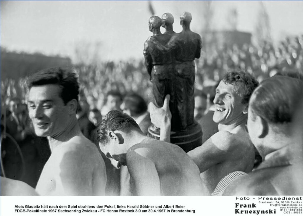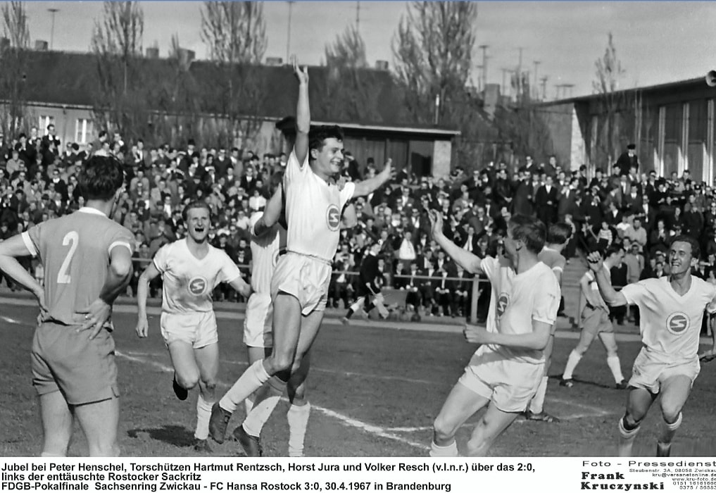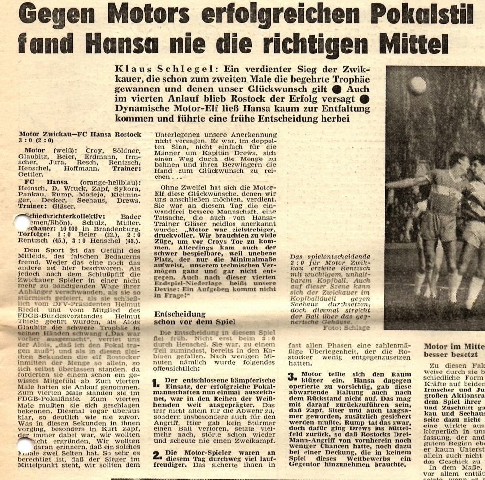 Und wie es sich für unseren Torjäger Rentzsch gehört, hatte er auch im Finale seinen Anteil am Erfolg. Sein Treffer zum 2:0, quasi mit dem Pausenpfiff, brachte die Vorentscheidung im Finale. Als Peter Henschel kurz nach Wiederanpfiff auf 3:0 stellte, gab es endgültig keine Zweifel mehr. Motor Zwickau gewann nach 1963 erneut den FDGB-Pokal.