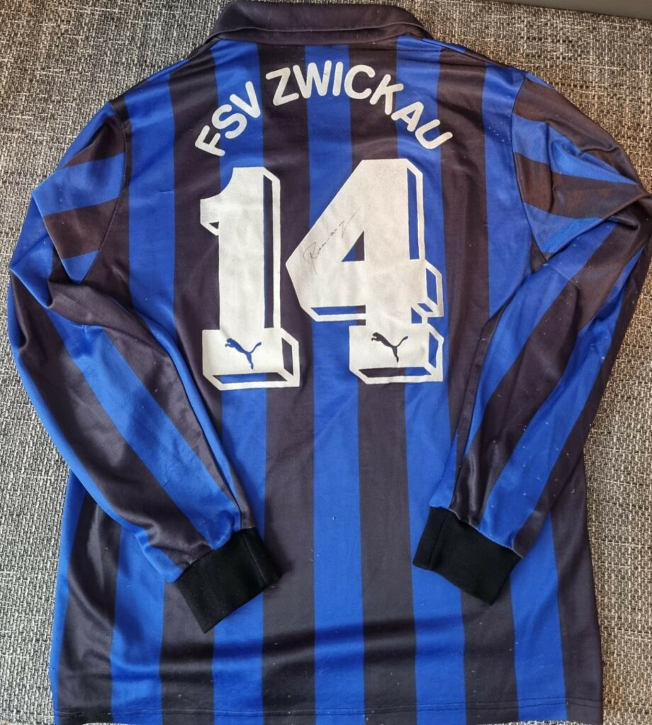 Unser Trikot wurde von Carsten Romanowsky getragen. Dahinter steckt eine interessante Geschichte, wie das Trikot den Weg zu einem Zwickauer Fans fand. Während seiner Zeit beim SV Kirchberg sorgte das Übersenden der FSV Hymne per Handy dafür, dass im nächsten Training dieses Trikot als kleines Dankeschön von Carsten übergeben wurde.
