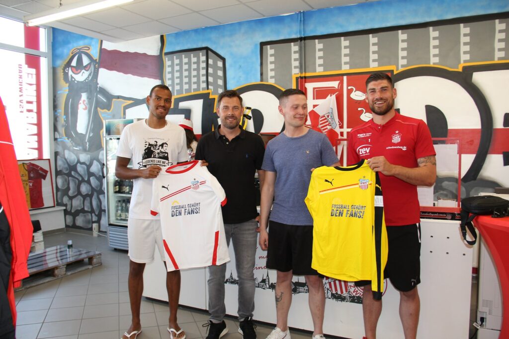 Im Rahmen der Wiedereröffnung des Schwäneshop, sowie der Vorstellung unserer ersten kleinen Ausstellung, erfolgte dann die offizielle Übergabe der Trikots direkt durch die Spieler selbst an uns.Dabei konnte auch ein Bild gemeinsam mit den Vereinslegenden Alois Glaubitz und Jürgen Croy aufgenommen werden. Fussball gehört den Fans – hierbei möchten auch wir auf den Verkaufsstart der neuen Dauerkarten hinweisen. Auf das wir in der kommenden Saison in großer Anzahl viele solcher Geschichten gemeinsam im Stadion erleben und zu alter Heimstärke finden werden!