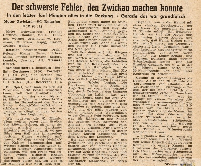 Am 09.09.1956 verliert Motor Zwickau beim SC Einheit Dresden mit 4:2. Als wäre das nicht schon schlimm genug, hängt die Rote Laterne der Republik auch noch in Zwickau. Und das nach 18.Spieltagen! Dies bedeutete Abstiegskampf in Zwickau und das war seit der ersten Teilnahme in der DDR Oberliga eher ein unbekanntes Wort in Zwickau, spielte man sonst meist in der oberen Tabellenhälfte mit. Eine Woche zuvor lief es schon nicht nach Wunsch. Gegen Rotation Leipzig spielten wir vor 20.000 Zuschauern im „Hexenkessel Georgi-Dimitroff-Stadion“ Remis. Der Ausgleich der Messestädter fiel dabei erst kurz vor Schluss.
