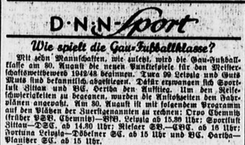 Im Sommer 1942 wurden die Anstoßzeiten logischerweise nicht mit irgendwelchen TV-Veträge oder Streamingdienste vereinbart. Bestimmendes Thema war der Blick auf die Fahrpläne der Bahn. Und so wurden Spiele an jenem 30.08.1942 von 14:30 Uhr bis 16:00 Uhr angepfiffen, damit auch alle Auswärtsmannschaften noch pünktlich die Heimreise antreten konnten.
