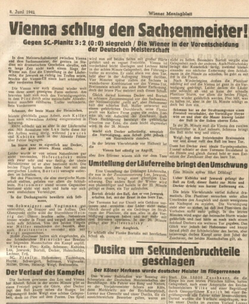 Wir wollen jedoch in die Wiener Kronenzeitung blicken, die uns im Vorbericht einen kleinen Einblick liefert, wie so eine Reise für Planitzer bei ein Spiel vor 80 Jahren und der Tag allgemein so ablief. Anpfiff war am Sonntag, den 07.06.1942 um 16 Uhr. Der Schiedsrichter Heinrich reiste aus Breslau an, ab 12 Uhr herrschte ein Spielverbot für alle Wiener Mannschaften und ab 14:30 Uhr fand ein Vorspiel der Jugendmannschaft von Vienna und Admira Wien statt.
