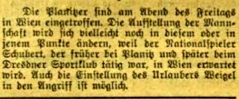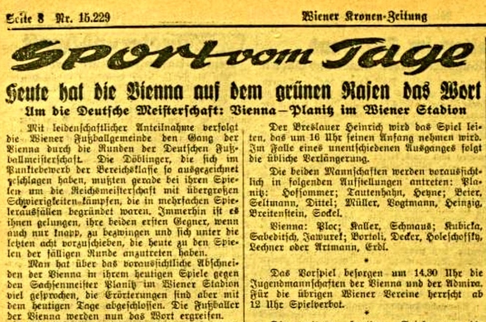 Nach dem Gewinn des Meistertitels in Sachsen hatte sich der Planitzer SC für die Deutsche Meisterschaft qualifiziert. Hatte die Planitzer in den ersten beiden Runden gegen Krakau und Breslau Heimrecht, führte die Reise für die Viertelfinalpartie nach Wien. Im dortigen Praterstadion wartete mit First Vienna FC 1894 nicht nur der älteste Fußballverein Österreich, sondern auch ein in jenen Jahren sehr erfolgreicher.