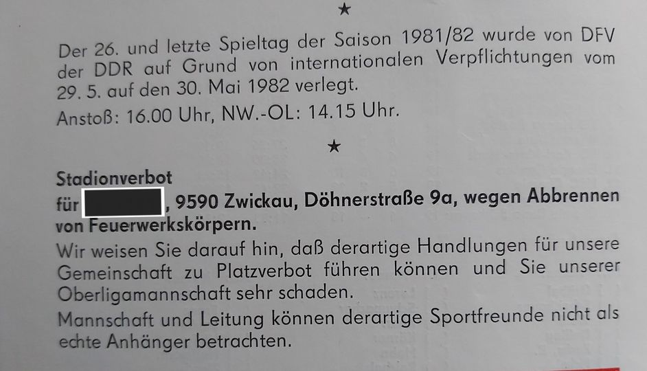 – Auch wenn es heute noch zu Online-Prangern im Fußballzusammenhang kommt, hat sich der Datenschutz in diesem Bereich im Vergleich zu 1982 verbessert. Deshalb haben auch wir den Namen des Fans geschwärzt, doch wir eine Bitte an alle: Kennt ihr Personen, die zu DDR-Zeiten mit einem Stadionverbot belegt wurden? Oder hattet ihr selbst eines? Oder habt ihr 1982 in der Döhnerstraße 9a gewohnt und wollt uns von jenem verhängnisvollen Tag erzählen?